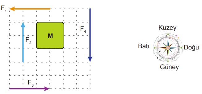 M cismine şekildeki F1 , F2 , F3 ve F4 kuvvetleri aynı anda etki edecektir.